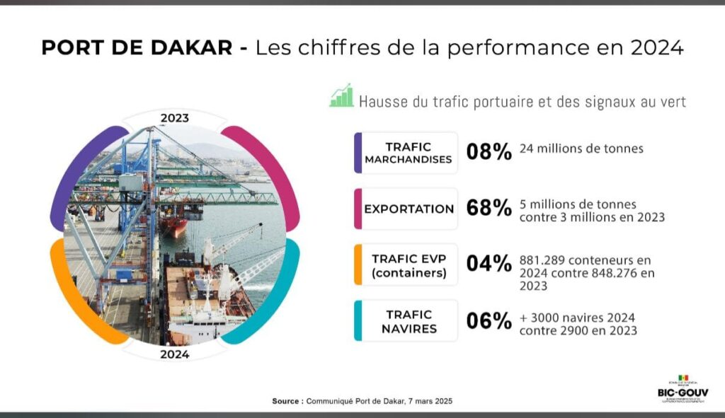Le PAD a annoncé plus de 3 000 escales en 2024, soit une augmentation de 6 % par rapport à 2023. En réponse aux évolutions du secteur, le Port a lancé un plan stratégique de repositionnement, avec des projets comme celui de Ndayane, qui devrait renforcer la position du Sénégal comme un hub clé en Afrique d’ici 2030.