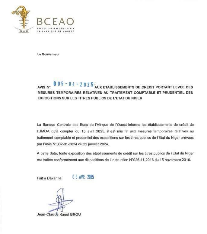 La Banque Centrale des États de l’Afrique de l’Ouest (BCEAO) a annoncé, dans un avis officiel daté du 3 avril 2025 et signé par son Gouverneur Jean-Claude Kassi Brou, la fin des règles dérogatoires appliquées aux titres publics du Niger. À compter du 15 avril, les banques de l’UEMOA devront de nouveau appliquer les règles classiques en matière de comptabilisation et d’évaluation de ces titres. Cette décision marque un tournant. Depuis janvier 2024, les établissements de crédit bénéficiaient de dispositions spéciales leur permettant de traiter les obligations et bons du Trésor nigériens selon des règles assouplies. Ce régime dérogatoire avait été mis en place dans un contexte de crise politique et économique sévère : coup d’État de juillet 2023, sanctions régionales, gel des avoirs, perte de confiance des marchés.