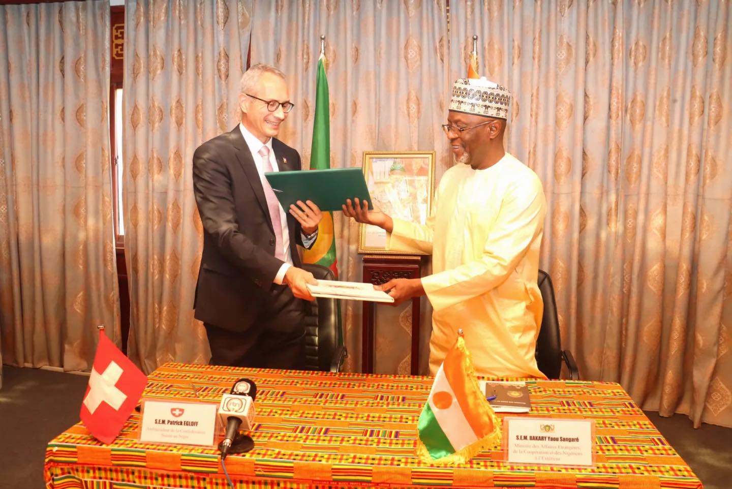 La cérémonie de signature s’est tenue entre le ministre nigérien des Affaires étrangères, Bakary Yaou Sangaré, et l’ambassadeur suisse Patrick Egloff, après une rencontre avec le président de la République, le général Abdourahamane Tiani.