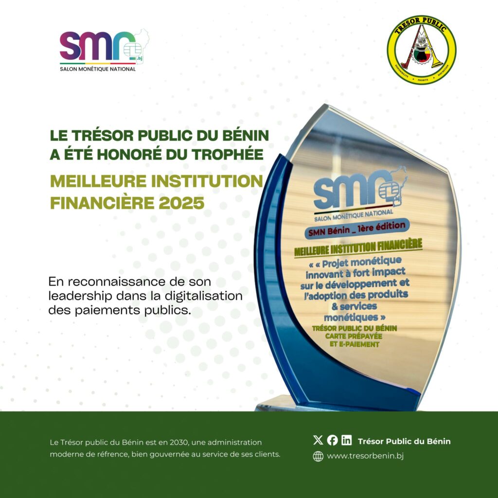La Direction générale du Trésor et de la Comptabilité publique a remporté le Trophée de la Meilleure Institution Financière 2025 lors de la première édition du Salon Monétique National (SMN Bénin). Cette distinction met en lumière les avancées du Trésor Public dans la modernisation de ses services numériques.
