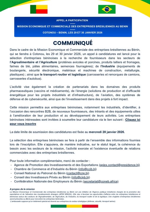 Les inscriptions sont ouvertes jusqu’au 28 janvier 2026. Les entreprises intéressées sont invitées à s’enregistrer afin de prendre part à cette mission qui se tiendra à Cotonou.