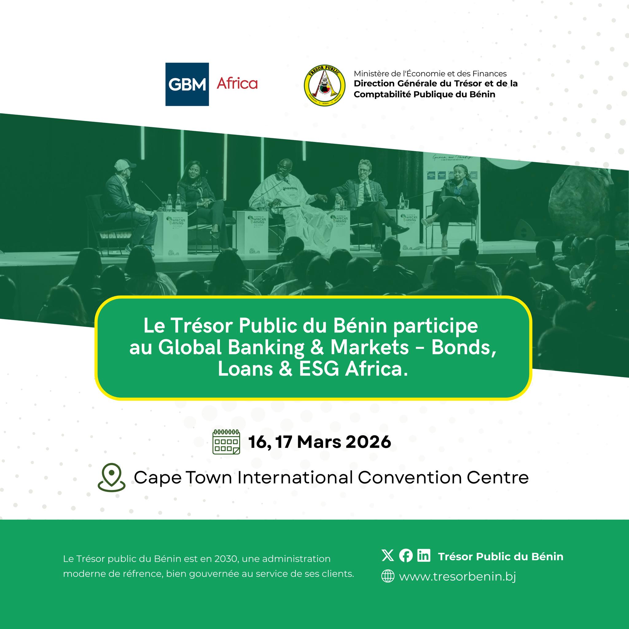 La Direction générale du Trésor et de la Comptabilité publique du Bénin prendra part au forum Global Banking & Markets – Bonds, Loans & ESG Africa, prévu les 16 et 17 mars 2026 au Cape Town International Convention Centre en Afrique du Sud.