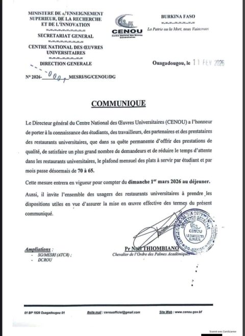 Au Faso, le Directeur général du Centre National des Œuvres Universitaires (CENOU) informe les étudiants, travailleurs et prestataires que le plafond mensuel des plats servis par étudiant est réduit