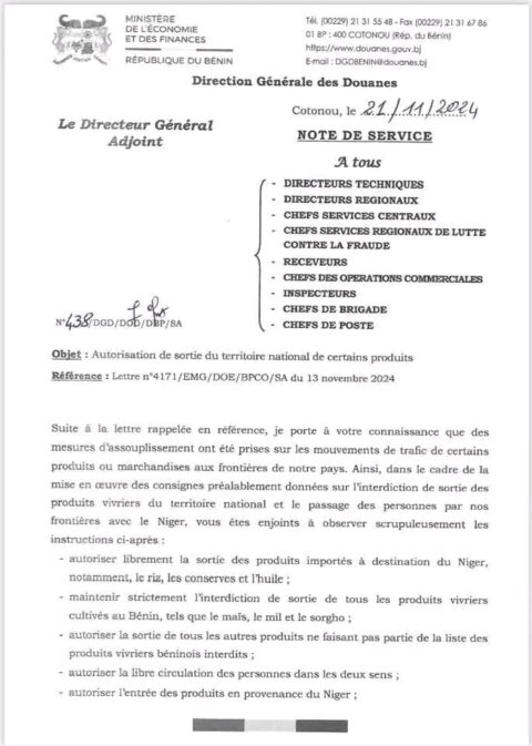Hier, 21 novembre 2024, la Direction générale des Douanes du Bénin a annoncé un assouplissement des mesures d’entrée, de transit et de sortie pour certains produits en provenance ou à