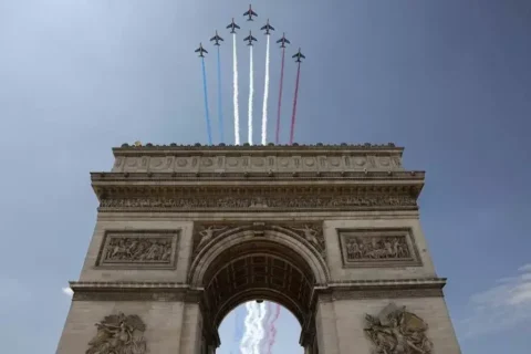 En moins de neuf minutes, 65 avions de l’armée française survolent Paris pour le défilé du 14-Juillet, dans une chorégraphie aérienne d’une précision extrême. Juchés au sommet de l’Arc de