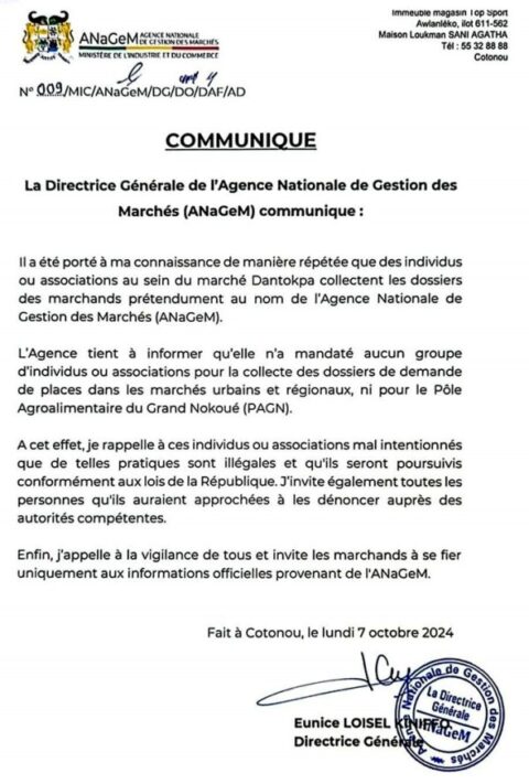 L'Agence Nationale de Gestion des Marchés (ANaGeM) met en garde contre des individus ou groupes collectant illégalement des dossiers pour obtenir des places dans les nouveaux marchés, notamment au