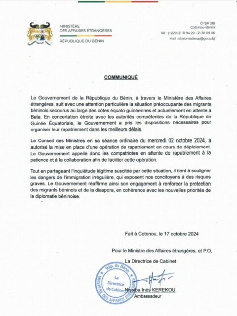 Le Gouvernement de la République du Bénin, à travers son Ministère des Affaires étrangères, suit avec une grande attention la situation des migrants béninois secourus près des côtes équato-guinéennes