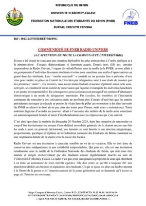Elle explique : « il nous a été donné de constater une situation déplorable des plus attentatoires à l’ordre publique et à la pérennisation d’acquis démocratiques si durement acquis. Depuis trois (03) ans, certains responsables de Radio Univers, l’organe de radiodiffusion sous la tutelle de la FNEB, ce sont alliés à un groupuscule d’individus désormais étudiants révolus pour constituer une mafia d’opportunistes au grand dam des étudiants. Leur « modus operandi » a consisté en un premier lieu à prétexter d’une crise pour mettre en place un Comité de Direction par désignation suite à une étude de dossiers par des présumés « aînés ». Ces derniers, sans aucun statut étudiant et aucune légitimité sinon celle auto-octroyée, se constituent en un comité de supervision qui façonne et manipule les individus parachutés à ces postes de responsabilité », renseigne la note.