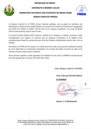 Dans ce meli mélo, « le Bureau Exécutif de la FNEB, devant l’opinion publique, met en garde ces individus mal intentionnés et imbus de leurs intérêts égoïstes, et rassure tout le monde universitaire de l’engagement sans faille de la faitière à rétablir l’état de droit via les organes compétents. Les locaux de Radio Univers restent fermés jusqu’à nouvel ordre. Le Conseil Central Fédéral (CCF) prend le contrôle de la situation et veillera à restaurer l’ordre constitutionnel avec rigueur. Il s’assurera que les principes d’alternance et de légalité soient scrupuleusement respectés, garantissant que seuls des étudiants régulièrement inscrits aient voix au chapitre. Par ailleurs, la FNEB invite à la paix et à l’unité autour de la radio, afin que cette institution continue de servir dignement la communauté estudiantine. Il est temps de mettre un terme aux abus et de restaurer une gouvernance juste et légitime. Nous resterons vigilants : la radio appartient aux étudiants et à eux seuls. La FNEB ne reculera devant rien pour garantir que cet acquis reste entre leurs mains », conclut Marius Tchomakou.
