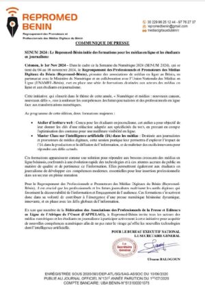Dans le cadre de la Semaine du Numérique 2024 (SENUM 2024), le Regroupement des Professionnels et Promoteurs des Médias Digitaux du Bénin (Repromed-Bénin) lance une série de formations destinées aux acteurs des médias en ligne et aux étudiants en journalisme. Cet événement, qui se déroulera du 4 au 8 novembre, est organisé en partenariat avec le Ministère du Numérique et l’Union Nationale des Médias en Ligne (UNAMEL-Bénin). L’information a été rendue publique au détour d’un communiqué en date d’hier, vendredi 1er novembre 2024.