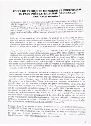 Hier, 8 novembre 2024, le procureur du Faso a révélé une affaire de détournement de fonds publics d’une ampleur considérable, impliquant plusieurs millions de francs CFA destinés à aider les personnes déplacées au Burkina Faso. Cette affaire concerne le ministère de l’Action humanitaire, un secteur clé pour la gestion de la crise humanitaire en cours dans le pays.
