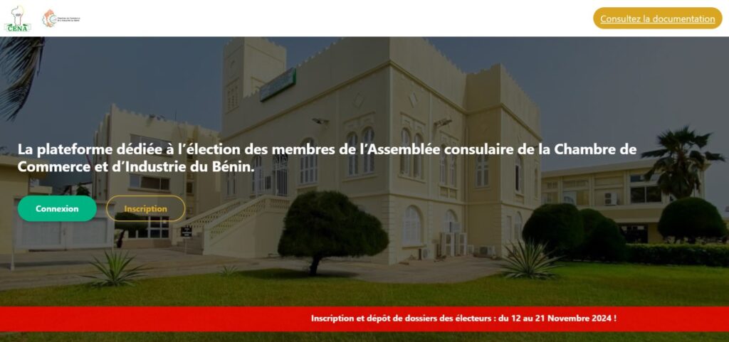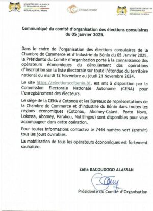 Dans le cadre de l’organisation des élections consulaires de la Chambre de Commerce et d’Industrie du Bénin du 05 janvier 2025, la Présidente du Comité d’organisation porte à la connaissance des opérateurs économiques du déroulement des opérations d’inscription sur la liste électorale sur toute l’étendue du territoire national du mardi 12 novembre au jeudi 21 novembre 2024.