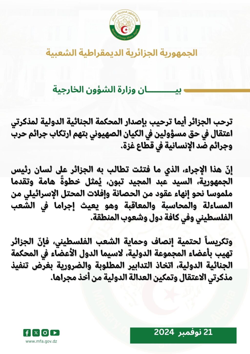 L’Algérie a salué la décision de la CPI, qui a émis des mandats d’arrêt contre le Premier ministre israélien Benjamin Netanyahu et l’ancien ministre de la Défense Galant. Le ministère des Affaires étrangères a publié sur sa page Facebook : « L’Algérie salue avec la plus grande fermeté l’émission par la Cour pénale internationale de mandats d’arrêt à l’encontre de responsables du régime sioniste, accusés de crimes de guerre et de crimes contre l’humanité dans la bande de Gaza ».