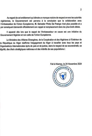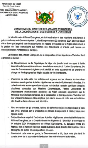 « Le Niger rejette l’aide humanitaire non sollicitée de l’UE pour les inondations. L’UE a ignoré les procédures diplomatiques en distribuant l’aide via des ONG sans autorisation et en poursuivant les opérations malgré les avertissements. En conséquence, le Niger a demandé le rappel de l’Ambassadeur de l’UE, M. Salvador Pinto Da França, « dont le nom est d’ailleurs assez révélateur ». »