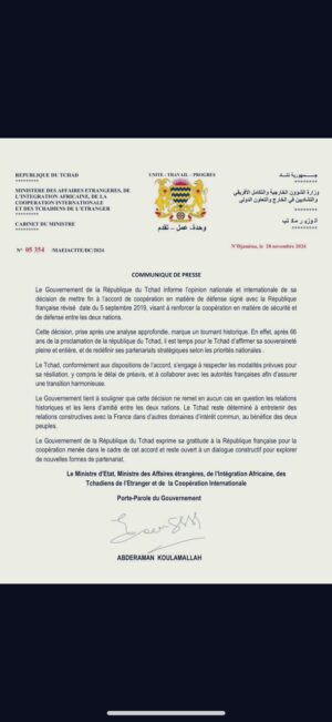Le Gouvernement de la République du Tchad a annoncé la fin de l’accord de coopération en matière de défense signé avec la République française en 2019. Cette annonce, faite dans un communiqué officiel, en date d’hier, jeudi 28 novembre, survient après une analyse approfondie de la situation géopolitique et des priorités stratégiques du pays. Dans ce contexte, le Tchad considère qu’il est désormais « temps pour le Tchad d’affirmer sa souveraineté pleine et entière » et de redéfinir ses partenariats internationaux, en fonction de ses propres priorités nationales.