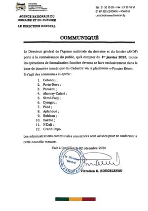 Dans un communiqué de presse en date du deux décembre dernier, le Directeur général de l’Agence nationale du domaine et du foncier (ANDF)annonce qu’à partir du 1er janvier 2025, la formalisation foncière au Bénin sera exclusivement réalisée via la plateforme e-Foncier, intégrée dans la base de données du Cadastre.