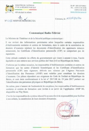 Dans un communiqué de presse en date de dix décembre 2024, le ministre de l’intérieur et de la sécurité publique, Alassane Séïdou, alerté sur une pratique contraire à la vision de l’exécutif. Laquelle pratique qui consiste à rejeter le dossier des mineurs dont la signature ne figure pas sur la Carte d’identification personnelle (CIP) et/ou la Carte biométrique.