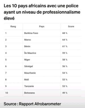 C’est officiel ! Le rapport Afrobarometer des pays africains avec une Police ayant un niveau de professionnalisme élevé. En effet, selon le classement, la Police burkinabè se classe en tête du rapport Afrobarometer, qui évalue la performance des forces de police dans 39 pays africains entre 2021 et 2023. Avec un score de 68 %, la Police du Burkina Faso est saluée pour son professionnalisme, son dévouement et sa discipline dans un contexte sécuritaire complexe.