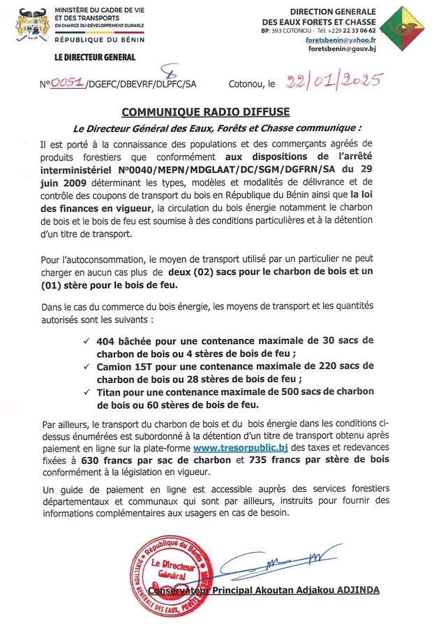Le Directeur général des Eaux, Forêts et Chasse, Akoutan Adjakou ADJINDA, a publié un communiqué concernant la circulation et le transport du bois énergie, notamment le charbon de bois et le bois de feu, en République du Bénin.