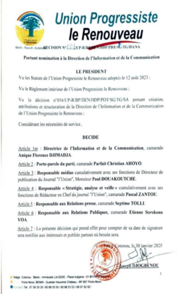 Dans un communiqué daté du 30 janvier 2025 et parvenu à KAWERU ce jour,  l’Union Progressiste le Renouveau a procédé à la nomination des responsables de la Direction de l’Information et de la Communication du parti. Selon le communiqué, le Président a pris cette décision suite à une évaluation des besoins organisationnels et en accord avec les statuts et règlements internes du parti.