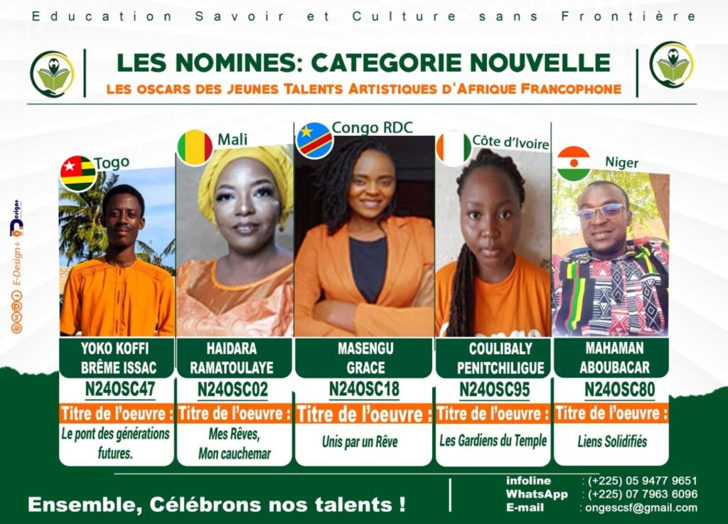 Le concours comprend quatre grandes catégories : la nouvelle, la poésie, la dissertation et l’art oratoire. Après une sélection parmi plus de 500 candidatures, les finalistes en littérature incluent Mahaman Aboubacar du Niger (Liens Solidifiés), Coulibaly Penitchiligue Sarah de Côte d’Ivoire (Les Gardiens du Temple), Haidara Ramatoulaye du Mali (Mes Rêves, Mon Cauchemar), Masengu Grâce de la RDC (Unis par un Rêve), et Yoko Koffi Brème Issac du Togo (Le Pont des Générations Futures).
