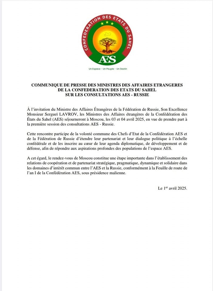 AccueilPolitique & SociétéEspace AES : les Ministres des Affaires étrangères attendus à Moscou les O3 et O4 prochains Espace AES : les Ministres des Affaires étrangères attendus à Moscou les O3 et O4 prochains Kaweru InfosIl y a 7 moisMoins d'1 min Communiqué de presse des Ministres des Affaires étrangères de la Confédération des Etats du Sahel sur les consultations AES-Russie, prévues les 03 et 04 avril 2025 à Moscou. Mots-clés:AESministres des affaires étrangèresMoscou Partage: PrécédentZambie : le Forum sur l’avenir des PMA s’est ouvert ce mardiSuivantUSA : Trump compare la condamnation de Le Pen à ses propres déboires judiciaires Dans la même catégorie Cotonou : la SGDS transforme la propreté urbaine avec un grand désensablement Kaweru InfosIl y a 1 an Belgique : Bruxelles dénonce l’interdiction de visas américains visant des représentants palestiniens Kaweru InfosIl y a 2 mois Le Royaume-Uni prêt à envoyer des troupes en Ukraine si nécessaire, selon Keir Starmer Kaweru InfosIl y a 9 mois Laisser un commentaire Laisser un commentaire Annuler la réponseVotre adresse e-mail ne sera pas publiée. Les champs obligatoires sont indiqués avec * Enregistrer mon nom, mon e-mail et mon site dans le navigateur pour mon prochain commentaire.
