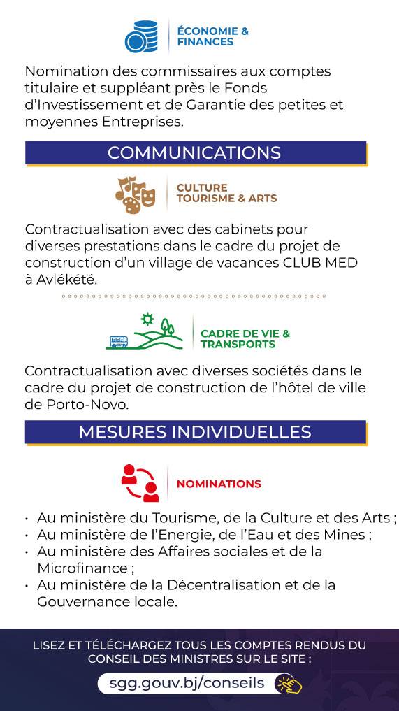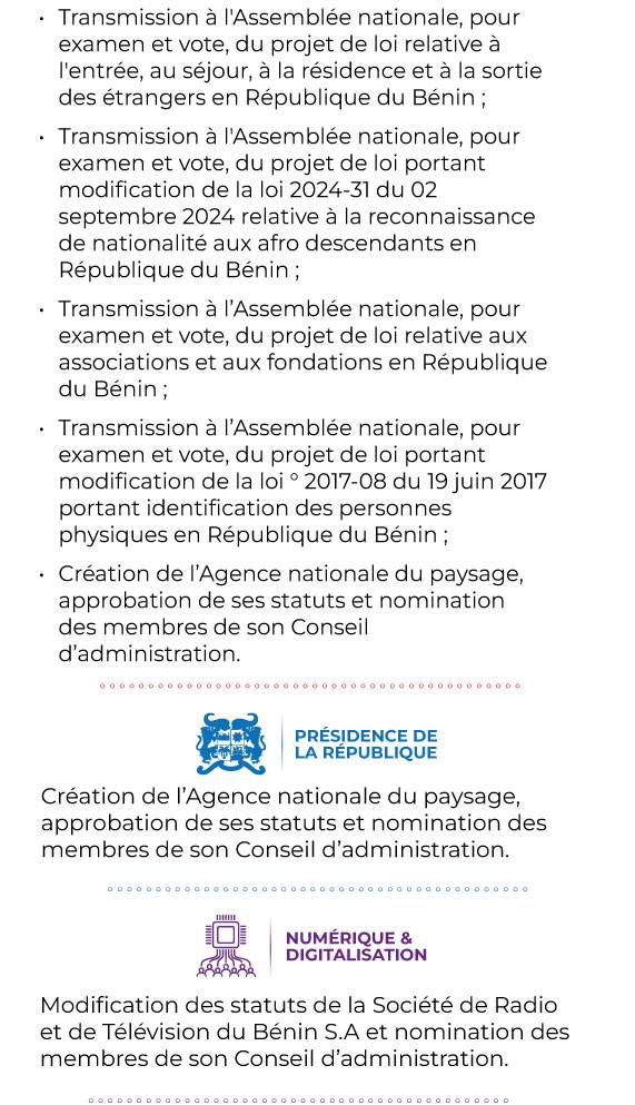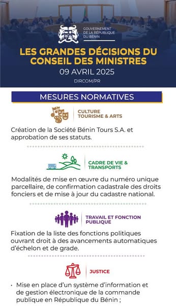 AccueilPolitique & SociétéBénin : voici les grandes décisions du Conseil des ministres de ce mercredi Bénin : voici les grandes décisions du Conseil des ministres de ce mercredi Kaweru InfosIl y a 7 moisMoins d'1 min Le Conseil des Ministres s’est réuni mercredi, neuf avril 2025, sous la présidence de Monsieur Patrice TALON, Président de la République, Chef de l’État, Chef du Gouvernement. En voici les grandes décisions : Mots-clés:grandes décisions Partage: PrécédentBénin–Serbie : une alliance sportive en constructionSuivantBénin : l’ATIDI garantit un prêt colossale de 507,5 millions d’euros accordé par la Deutsche Bank Dans la même catégorie Yémen : les Houthis étendent leur blocus naval aux États-Unis Kaweru InfosIl y a 8 mois Israël : un ex-général évite l’Afrique du Sud de peur d’être arrêté pour crimes à Gaza Kaweru InfosIl y a 2 mois Affaire de blanchiment d’argent : l’ex-PM mauricien Pravind Jugnauth en garde à vue Kaweru InfosIl y a 9 mois Laisser un commentaire Laisser un commentaire Annuler la réponseVotre adresse e-mail ne sera pas publiée. Les champs obligatoires sont indiqués avec * Enregistrer mon nom, mon e-mail et mon site dans le navigateur pour mon prochain commentaire.