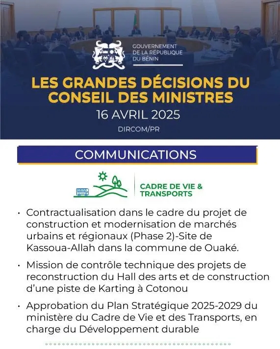Le Conseil des Ministres s’est réuni ce mercredi seize avril 2025, sous la présidence de Monsieur Patrice TALON, Président de la République, Chef de l’État, Chef du Gouvernement. Voici les grandes décisions qui ont sanctionné la séance.