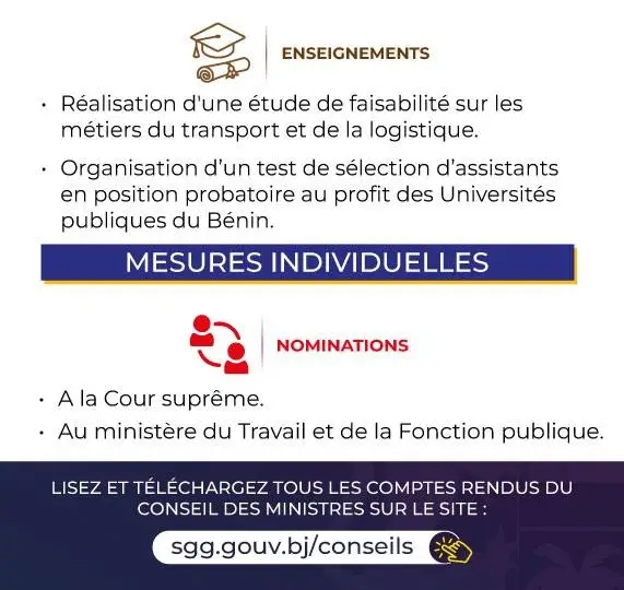 Le Conseil des Ministres s’est réuni ce mercredi seize avril 2025, sous la présidence de Monsieur Patrice TALON, Président de la République, Chef de l’État, Chef du Gouvernement. Voici les grandes décisions qui ont sanctionné la séance.