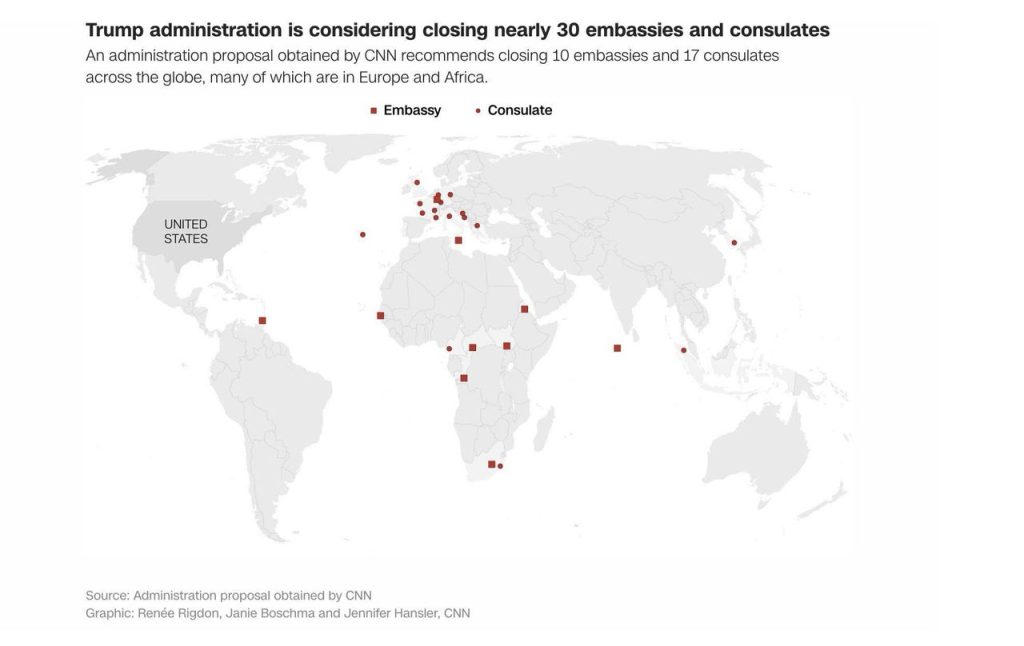 L’administration Trump s’apprête à fermer près de 30 ambassades et consulats américains dans le monde, révèle un document interne du département d’État, relayé par le Washington Post et CNN. Cette restructuration, inédite par son ampleur, s’inscrit dans un vaste projet de réorganisation de la diplomatie américaine, piloté par le Département de l’efficacité gouvernementale (DOGE), un organisme fondé par Elon Musk.