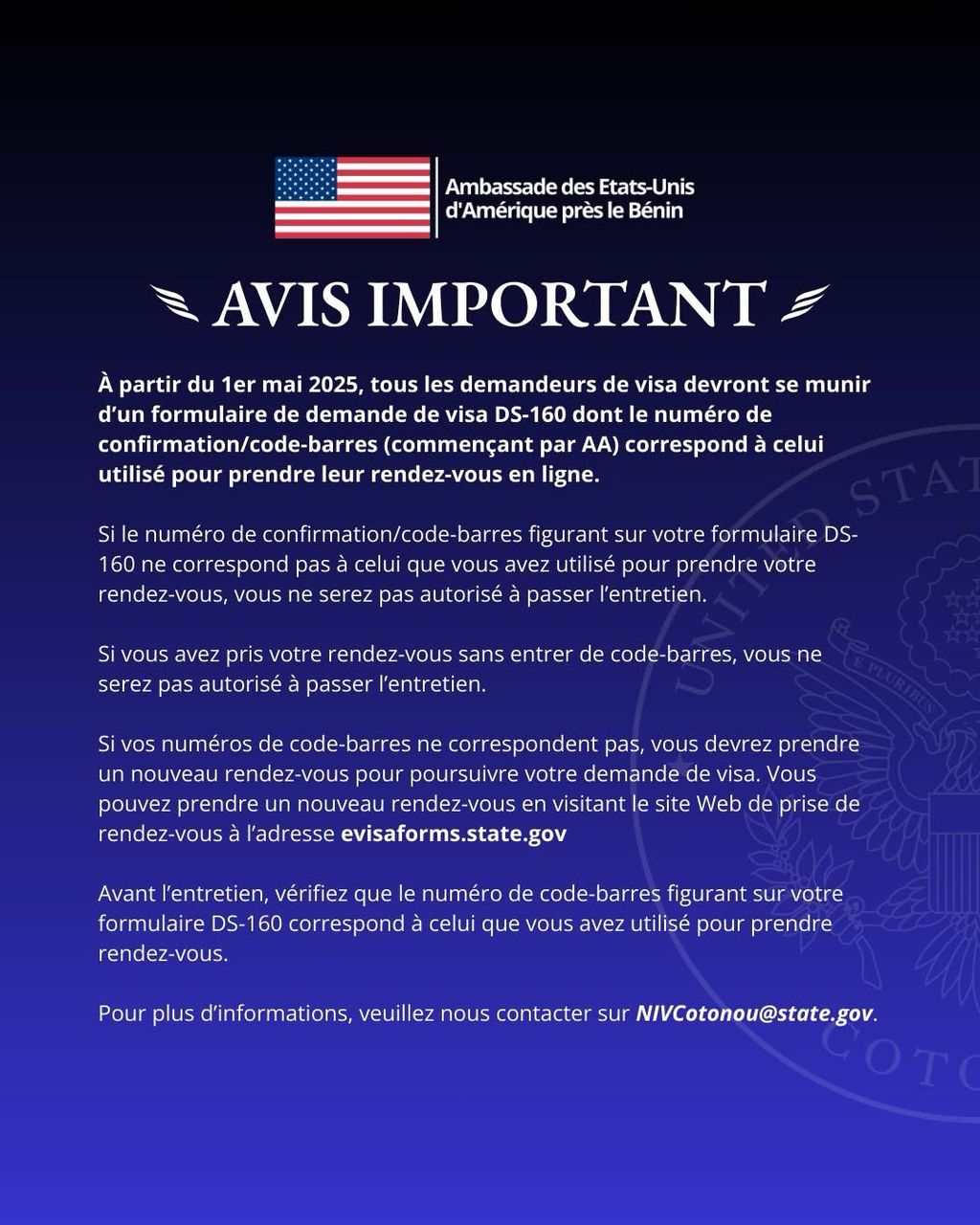 A travers un communiqué, l’ambassade des USA près le Bénin, informe qu’à compter du 1er mai 2025, tous les Béninois, demandeurs de visa devront impérativement se munir d’un formulaire de demande de visa DS-160 dont le numéro de confirmation/code-barres (commençant par AA) correspond exactement à celui utilisé pour prendre leur rendez-vous en ligne. Selon la note circulaire, ce changement vise à simplifier le processus et renforcer la sécurité des demandes de visa.