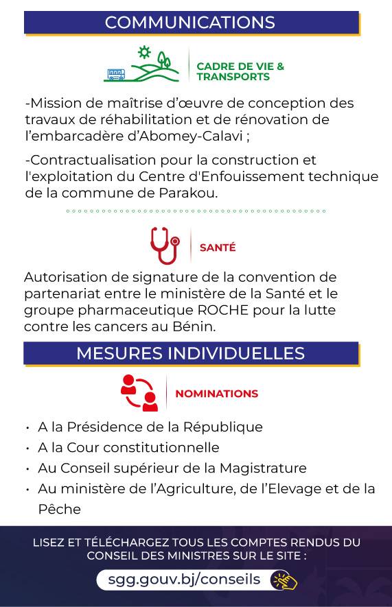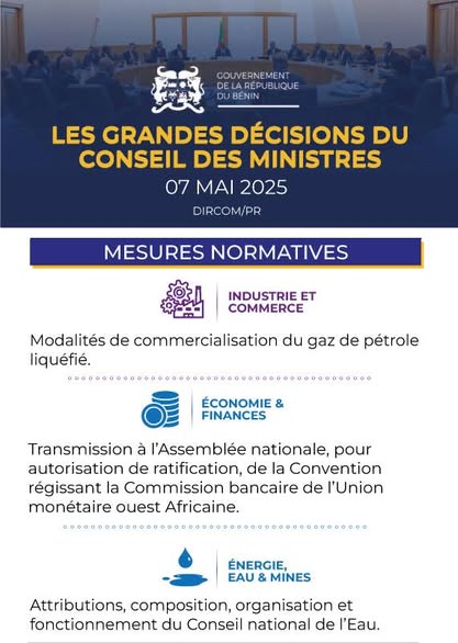 AccueilPolitique & SociétéBénin : voici les grandes décisions du Conseil des ministres de ce mercredi Bénin : voici les grandes décisions du Conseil des ministres de ce mercredi Kaweru Infosil y a 7 moisMoins d'1 min Le Conseil des Ministres s’est réuni ce mercredi, sept mai 2025, sous la présidence de Monsieur Patrice TALON, Président de la République, Chef de l’État, Chef du Gouvernement. En voici les grandes décisions… Shares: Article PrécédentDiplomatie : le Bénin et les États-Unis renforcent leur coopération économique et sécuritaireArticle suivantTrafic aérien : Royal Air Maroc s’installe au nouveau terminal JFK dès 2026 Dans la même catégorie Cessez-le-feu de Pâques prononcé par Poutine : Kiev accuse Moscou de violations massives Kaweru Infosil y a 8 mois L’ONU accorde une aide initiale de 5 millions de dollars au Myanmar face au séisme Kaweru Infosil y a 8 mois Côte d’Ivoire : Affi N’Guessan conteste son rejet et annonce une saisine du procureur Kaweru Infosil y a 3 mois