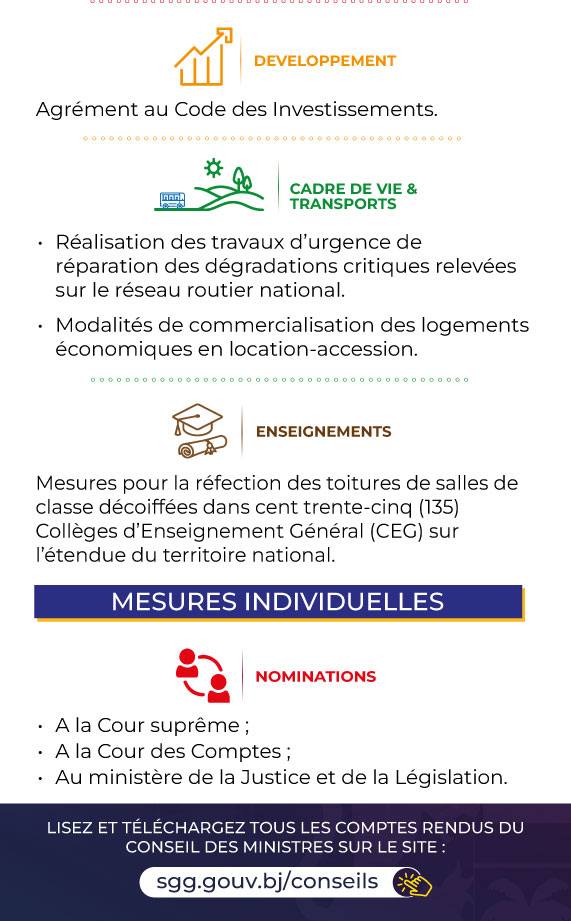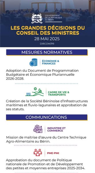 AccueilPolitique & SociétéBénin : voici les grandes décisions du Conseil des ministres de ce mercredi Bénin : voici les grandes décisions du Conseil des ministres de ce mercredi Kaweru InfosIl y a 5 moisMoins d'1 min Au Bénin, le Conseil des Ministres s’est réuni ce mercredi 28 mai 2025, sous la présidence Patrice TALON, Président de la République, Chef de l’État, Chef du Gouvernement. En voici les grandes décisions. Mots-clés:BéninConseil des ministresgrandes décisions Partage: PrécédentLe président Museveni, au pouvoir depuis environ 40 ans, implore le pardon des Ougandais pour les fautes commises par son régimeSuivantL’Espagne promet d’amplifier sa pression contre les massacres à Gaza Dans la même catégorie Accident de la caravane du parti Pastef à Touba au Sénégal : un deuxième décès enregistré Kaweru InfosIl y a 12 mois Le Vietnam promeut son nom de domaine national « .vn » Kaweru InfosIl y a 2 mois Présidentielle ivoirienne : Vincent Toh Bi Irié dépose sa candidature Kaweru InfosIl y a 2 mois Laisser un commentaire Laisser un commentaire Annuler la réponseVotre adresse e-mail ne sera pas publiée. Les champs obligatoires sont indiqués avec * Enregistrer mon nom, mon e-mail et mon site dans le navigateur pour mon prochain commentaire.