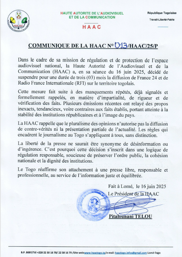 La Haute Autorité de l’Audiovisuel et de la Communication (HAAC) du Togo a annoncé ce lundi 16 juin 2025 la suspension, pour une durée de trois mois, de France 24 et de Radio France Internationale (RFI) sur l’ensemble du territoire national. Cette décision, entérinée à l’issue d’une séance plénière, fait suite à des « manquements répétés » de ces deux médias français, déjà signalés par l’institution dans le passé. Il est reproché aux chaînes concernées une série d’émissions ayant relayé des informations jugées « inexactes », « tendancieuses » et « contraires aux faits établis ». Selon la HAAC, ces contenus auraient nui à « la stabilité des institutions républicaines » et à « l’image du pays ».