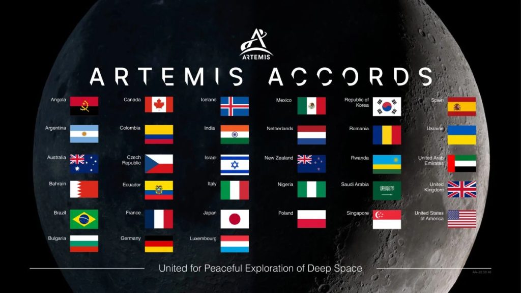 Les Accords Artemis, lancés en 2020 par les États-Unis et la NASA, définissent des principes de collaboration pour l’exploration civile et pacifique de la Lune, de Mars, des astéroïdes et d’autres corps célestes. Inspirés du Traité sur l’espace extra-atmosphérique de 1967, ces lignes directrices visent à encadrer les futures activités spatiales tout en promouvant la transparence, la durabilité et le partage des bénéfices.