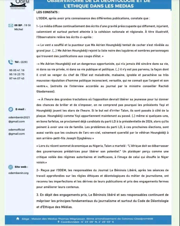 Au Bénin, l’Observatoire de la déontologie et de l’éthique dans les médias (Odem) a condamné, ce onze août 2025, le journal Le Béninois Libéré, les journalistes Aboubacar Takou et Akilou Yacoubou, pour des publications jugées diffamatoires, injurieuses et dangereuses pour la cohésion sociale, tant au niveau national que régional. Ces écrits ciblaient notamment Maître Adrien Houngbédji, ancien président de l’Assemblée nationale, l’ex-président Boni Yayi, le Parti du Renouveau Démocratique (PRD), ainsi que le président de la transition au Niger, Abdourahmane Tiani, et son gouvernement.