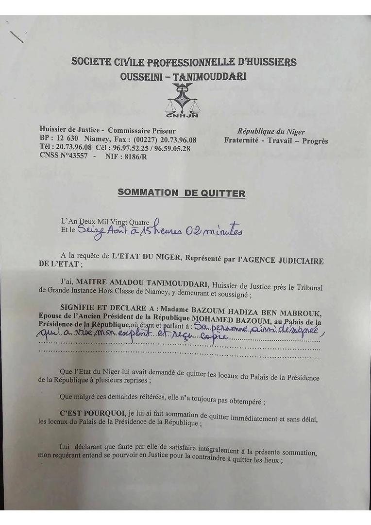 Selon le document, l’État avait à plusieurs reprises demandé à Mme Bazoum de quitter les lieux. Faute d’obtempérer, Maître Amadou Tanimouddari, huissier de justice près le Tribunal de Grande Instance Hors Classe de Niamey, a été mandaté pour lui notifier la sommation de libérer immédiatement et sans délai la résidence présidentielle.