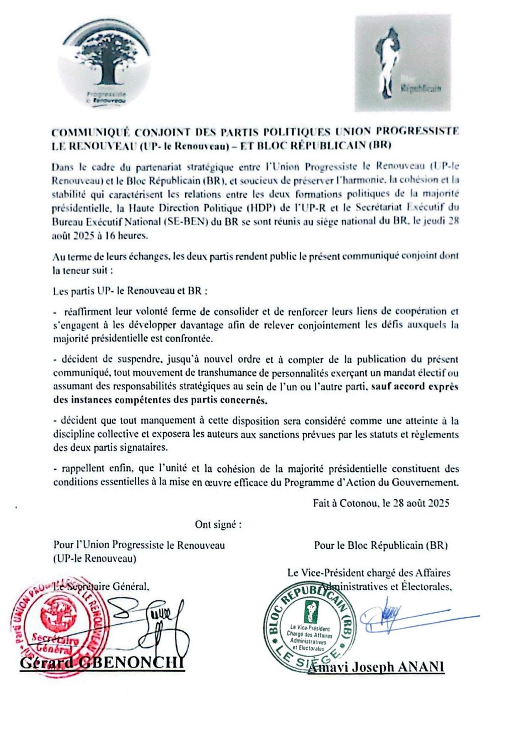 Au détour d’un communiqué en date du 28 août 2025 portant les signatures de Gérard Cbenonchy, Secrétaire Général de l’UP-le Renouveau, et de Joseph Anani G, Vice-Président chargé des affaires administratives et électorales du BR, l’Union Progressiste le Renouveau (UP-le Renouveau) et le Bloc Républicain (BR) ont réaffirmé leur partenariat stratégique au sein de la majorité présidentielle. La rencontre s’est tenue au siège national du BR à Cotonou, réunissant la Haute Direction Politique (HDP) de l’UP-R et le Secrétariat Exécutif du Bureau Exécutif National (SE-BEN) du BR.