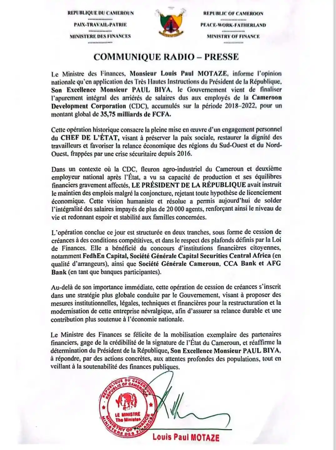 Le ministre camerounais des Finances, Louis Paul Motaze, a annoncé le règlement complet des arriérés de salaires des employés de la Cameroon Development Corporation (CDC), couvrant la période 2018-2022 et représentant un montant total de 35,75 milliards de FCFA.