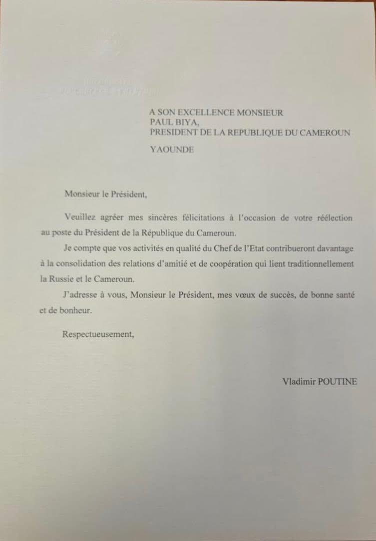 « Veuillez agréer mes sincères félicitations à l’occasion de votre réélection au poste du Président de la République du Cameroun. »