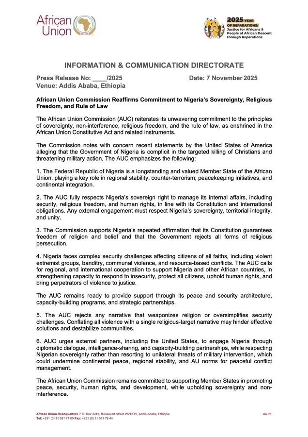 Reconnaissant les défis sécuritaires complexes auxquels fait face le Nigeria, notamment les violences intercommunautaires, le banditisme, les conflits liés aux ressources et les attaques de groupes extrémistes, la CUA appelle à un renforcement de la coopération régionale et internationale afin d’aider le pays à protéger tous ses citoyens, à défendre les droits humains et à traduire les auteurs de violences en justice.