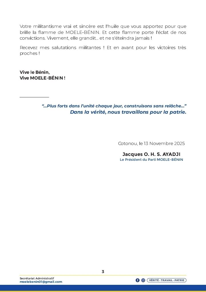 Au Bénin, le président du parti Moele-Bénin, Jacques Ayadji appelle tous les militants du parti à entretenir la flamme du parti. C’est au détour d’un message en date d’hier soir, jeudi treize novembre 2025. Il souligne que la flamme du parti grandit chaque jour et ne s’éteindra jamais. Il insiste sur le courage et la détermination comme clés pour avancer et renforcer l’action militante.
