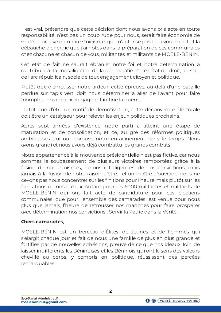 Bénin : le président du parti Moele-Bénin exhorte ses militants à rester déterminés suite à l’invalidation de leur candidature aux communales de 2026