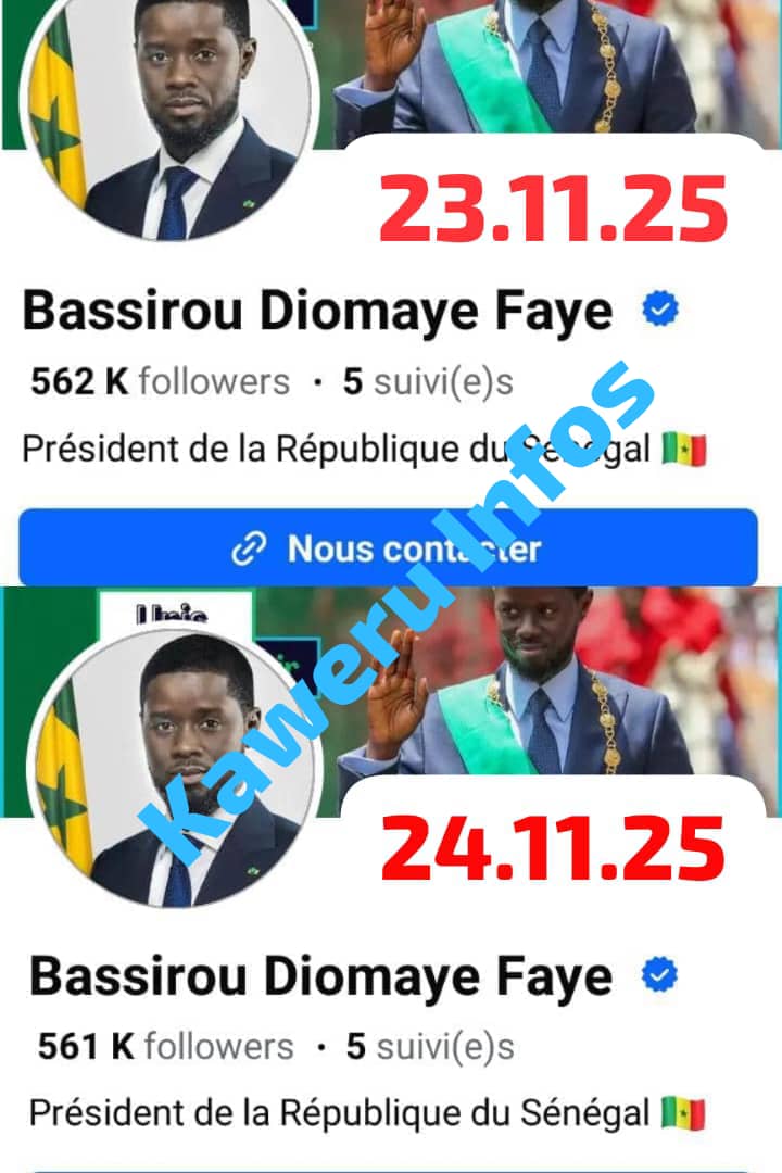 Le Président de la République du Sénégal,  Bassirou Diomaye Faye a enregistré une baisse d’environ mille abonnés sur sa page Facebook entre hier soir et ce matin. Cette chute serait liée aux rumeurs selon lesquelles le climat se serait dégradé entre le chef de l’État et son Premier ministre, Ousmane Sonko.