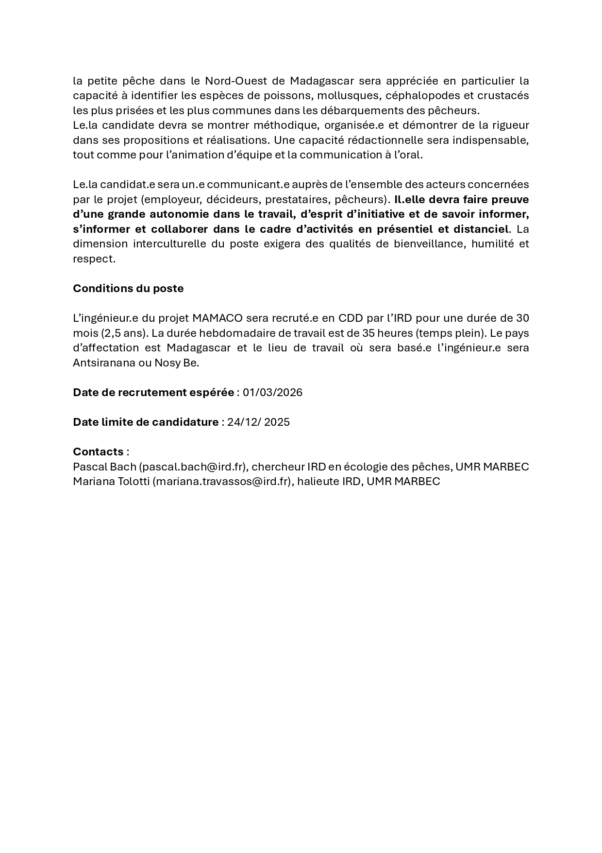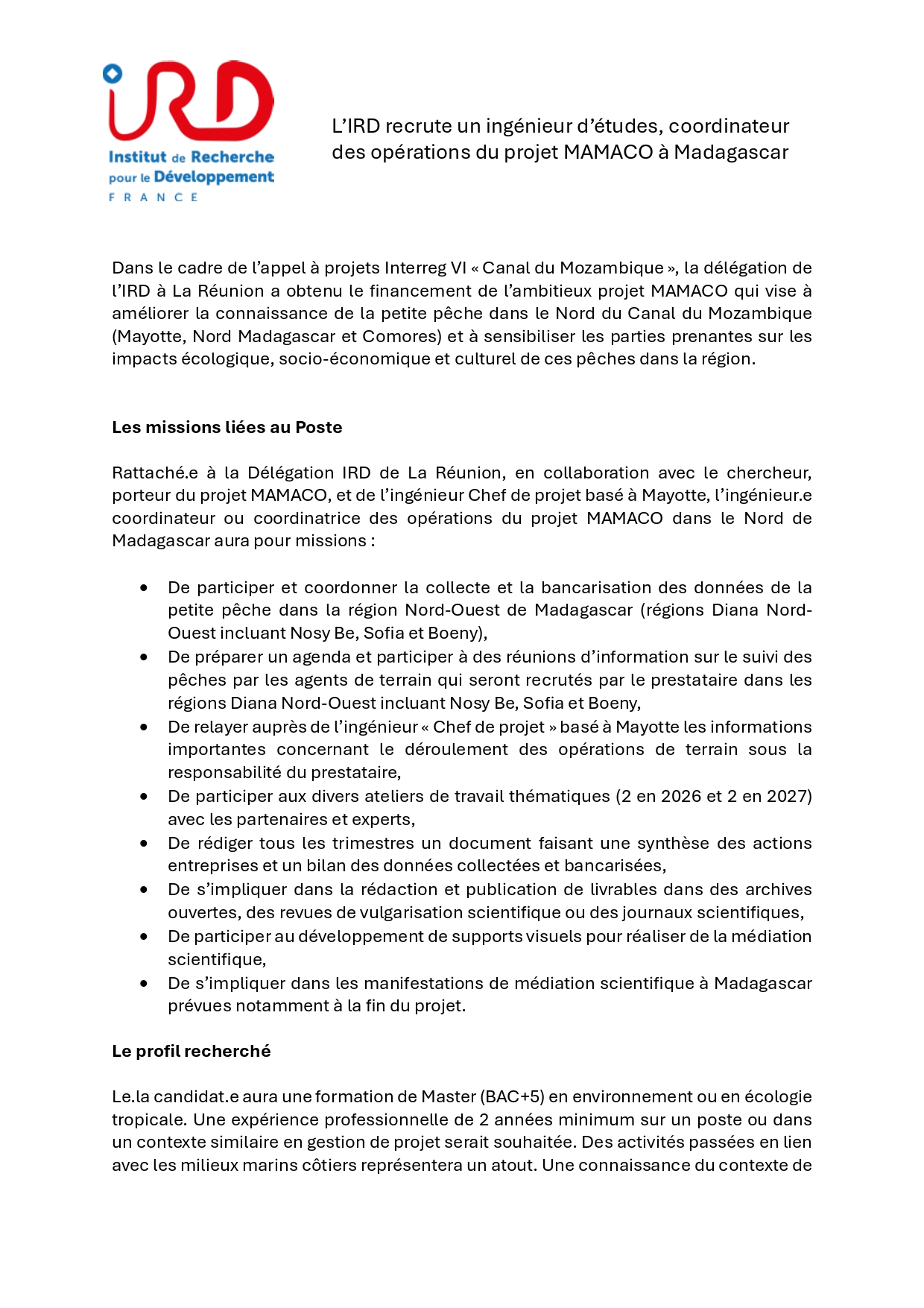 L’Institut de recherche pour le développement (IRD) recherche un·e ingénieur·e d’études, coordinateur·trice des opérations pour le programme Interreg VI « Canal du Mozambique ». Le projet MAMACO vise à renforcer la connaissance de la petite pêche dans le nord du canal (Mayotte, Nord Madagascar, Comores) et à sensibiliser les acteurs aux enjeux écologiques, socio-économiques et culturels liés à cette activité.