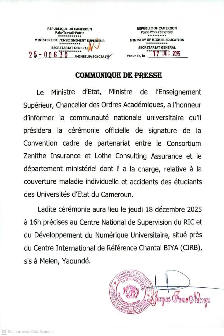 Le Ministre d’État camerounais, Ministre de l’Enseignement Supérieur, Pr Jacques Fame Ndongo, présidera ce jeudi 18 décembre 2025 la cérémonie officielle de signature d’un partenariat stratégique avec le consortium Zenithe Insurance et Lothe Consulting Assurance.
