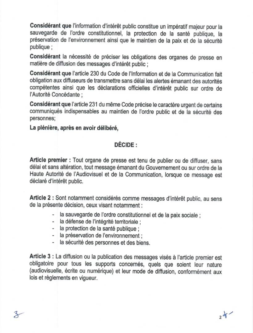 Selon l’article 1er de cette décision, tout organe de presse est tenu de publier ou de diffuser, sans délai et sans modification, tout message officiellement déclaré d’intérêt public par le gouvernement ou la HAAC. Cette obligation s’applique à l’ensemble des supports médiatiques, quels que soient leur nature ou leur statut.