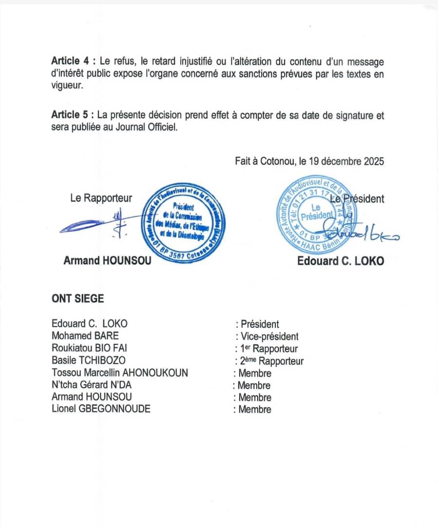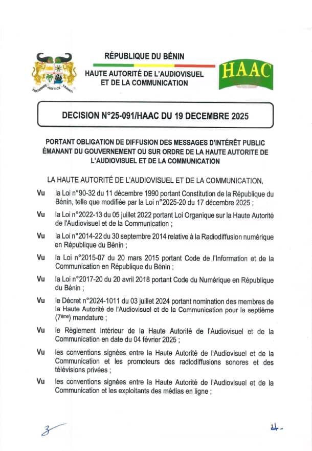 La Haute Autorité de l’Audiovisuel et de la Communication (HAAC) du Bénin a pris une décision majeure encadrant le fonctionnement des organes de presse. Par la Décision n°25-091 du 19 décembre 2025, rendue publique ce mardi 23 décembre, l’institution impose à tous les médias l’obligation de diffuser tout message d’intérêt public émanant du gouvernement ou transmis sur instruction de la HAAC.