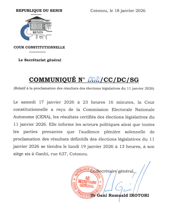 Après la publication des résultats provisoires par la Commission électorale nationale autonome (CENA), au Bénin, la Cour constitutionnelle annonce la proclamation officielle des résultats définitifs des élections législatives du 11 janvier 2026. L’information a été rendue publique à travers un communiqué de la haute juridiction en date d’hier soir, dimanche 18 janvier 2026.