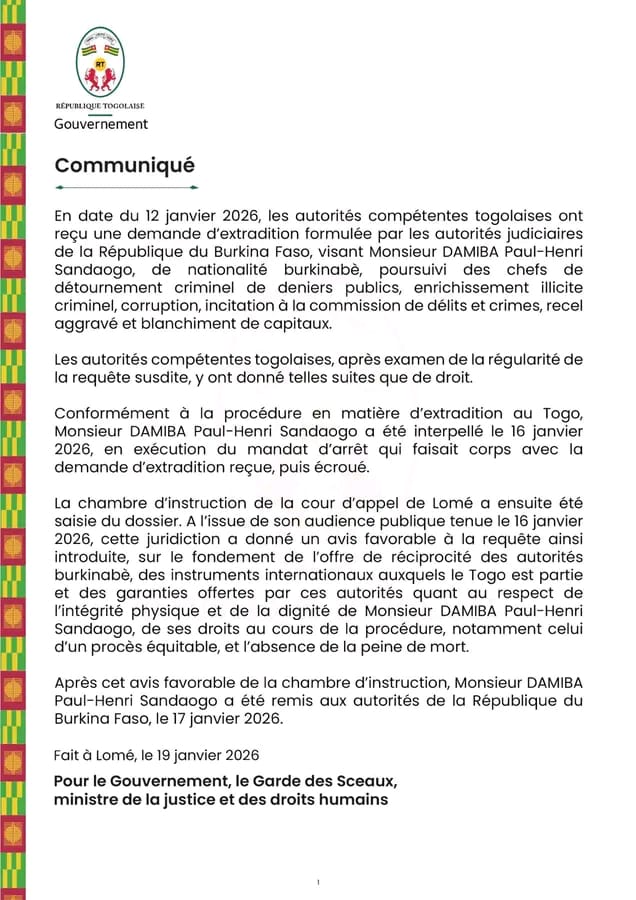 Sur la base de cet avis judiciaire, Paul-Henri Sandaogo Damiba a été remis aux autorités burkinabè le 17 janvier 2026. Le communiqué officiel du gouvernement togolais, signé par le garde des Sceaux, ministre de la Justice et des Droits humains, confirme l’achèvement de la procédure et la coopération judiciaire entre Lomé et Ouagadougou.